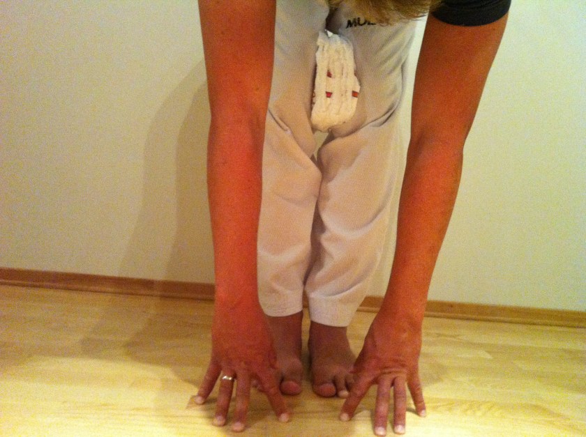 Her prøver jeg en standard «prøve å ta i gulvet med stive bein» øvelse. Helt uten oppvarming, og med støle muskler etter gårsdagens tøying, er dette så langt jeg kommer.