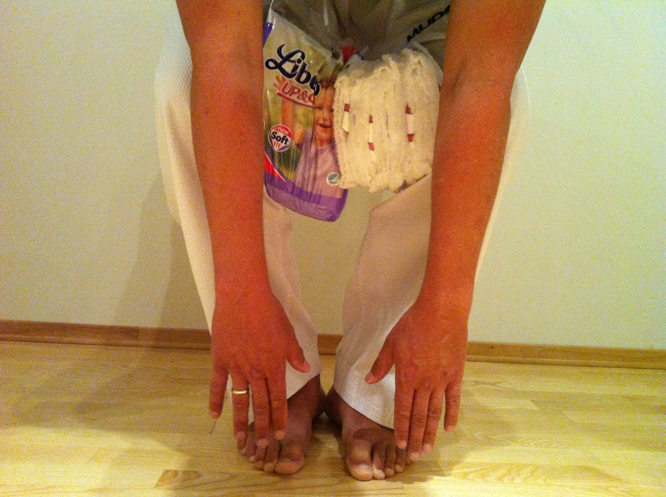 I min iver over å prøve dette trikset med en gang, tok jeg det nærmeste jeg hadde for hånden – en liten bunke Libero Up & Go nr 7. Utrolig nok fungerte det veldig bra. Jeg kom flere centimeter ned og tok lett i gulvet. Easy peasy 🙂
