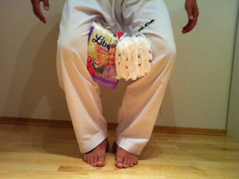 Jeg kan dermed anbefale bleier som stretchinghjelpemiddel… fortrinnsvis de ubrukte..
