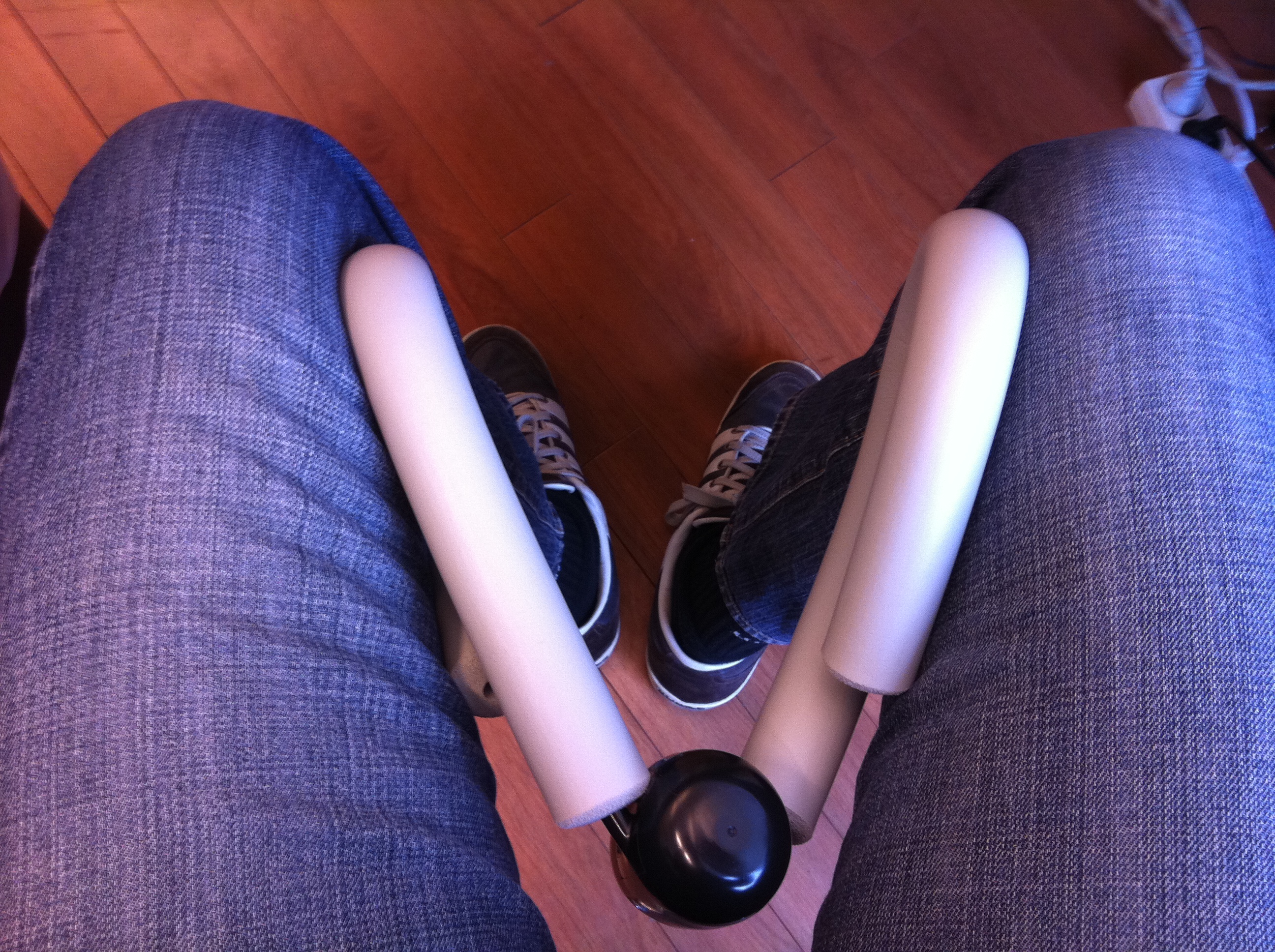 Her er lårtrimmeren i action – for øyeblikket under kontorpulten. Frontplate på pulten kan anbefales for de mer selvbevisste: