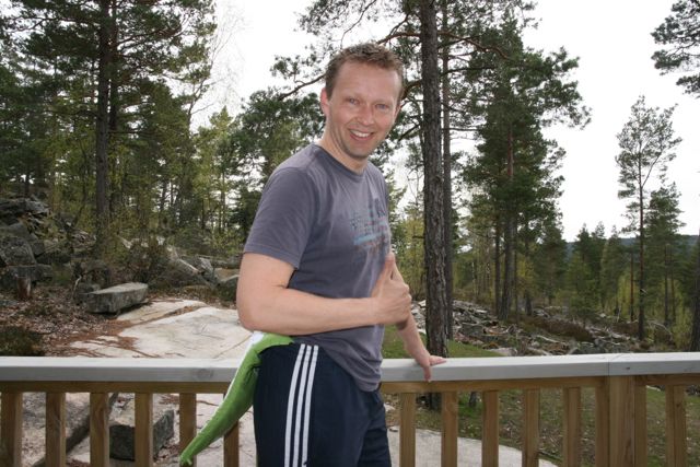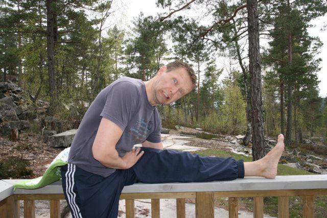 Det første du må gjøre er å lokalisere en stolpe eller lignende i din umiddelbare nærhet. Har du ingen stolpe sider du? Da skal du vite at et solid bordbein, en trappestolpe, et gelender, en sovende svigermor, eller noe annet som ikke lar seg flytte også fungerer. Det neste du må gjøre er å sørge for at gulvplassen rundt deg er fri for leker, matsmuler og klær. Du må kunne holde rundt stolpen slik jeg gjør på bildene, eller du kan forlenge rekkevidden din ved å bruke et belte eller tau som du slenger rundt.