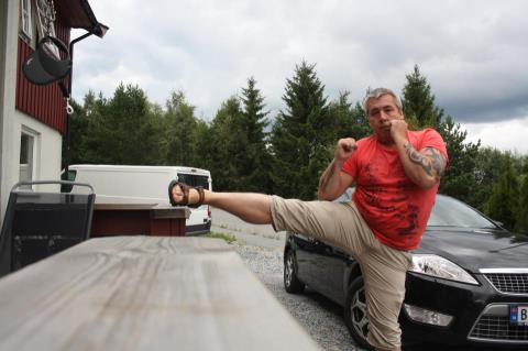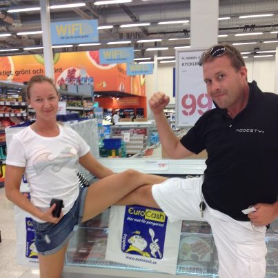 Kristoffer, Bente og Christer har vært på kick-off i de svenske skoger for instruktørene fra Mudo Oppegård . Og som alle gode nordmenn ønsker også de å bidra til den svenske økonomien ved å harryhandle litt. Her er det Kristoffer som tøyer bakside lår over et brett med Ramlösa.