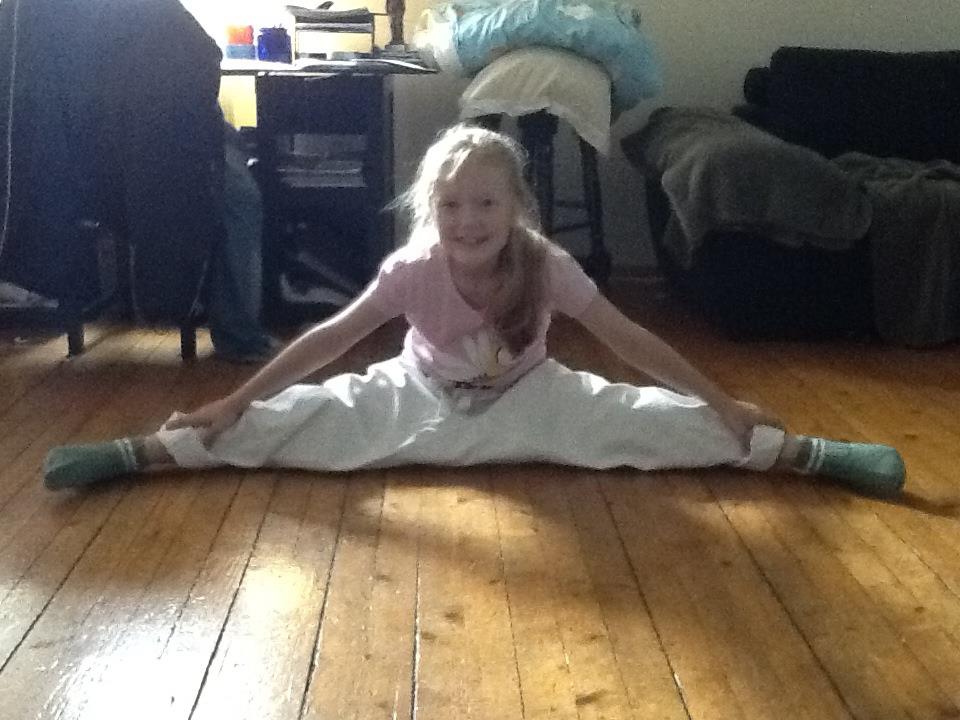Celine tøyer hjemme og viser gjerne hvor langt ut hun kommer ut i sittende splitt.