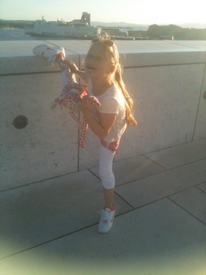 Celine er også på tur. Her er hun på Operataket. Ikke noe er som å stretche på en av Oslos største og flotteste severdigheter. Hold godt på kosedyret Celine.