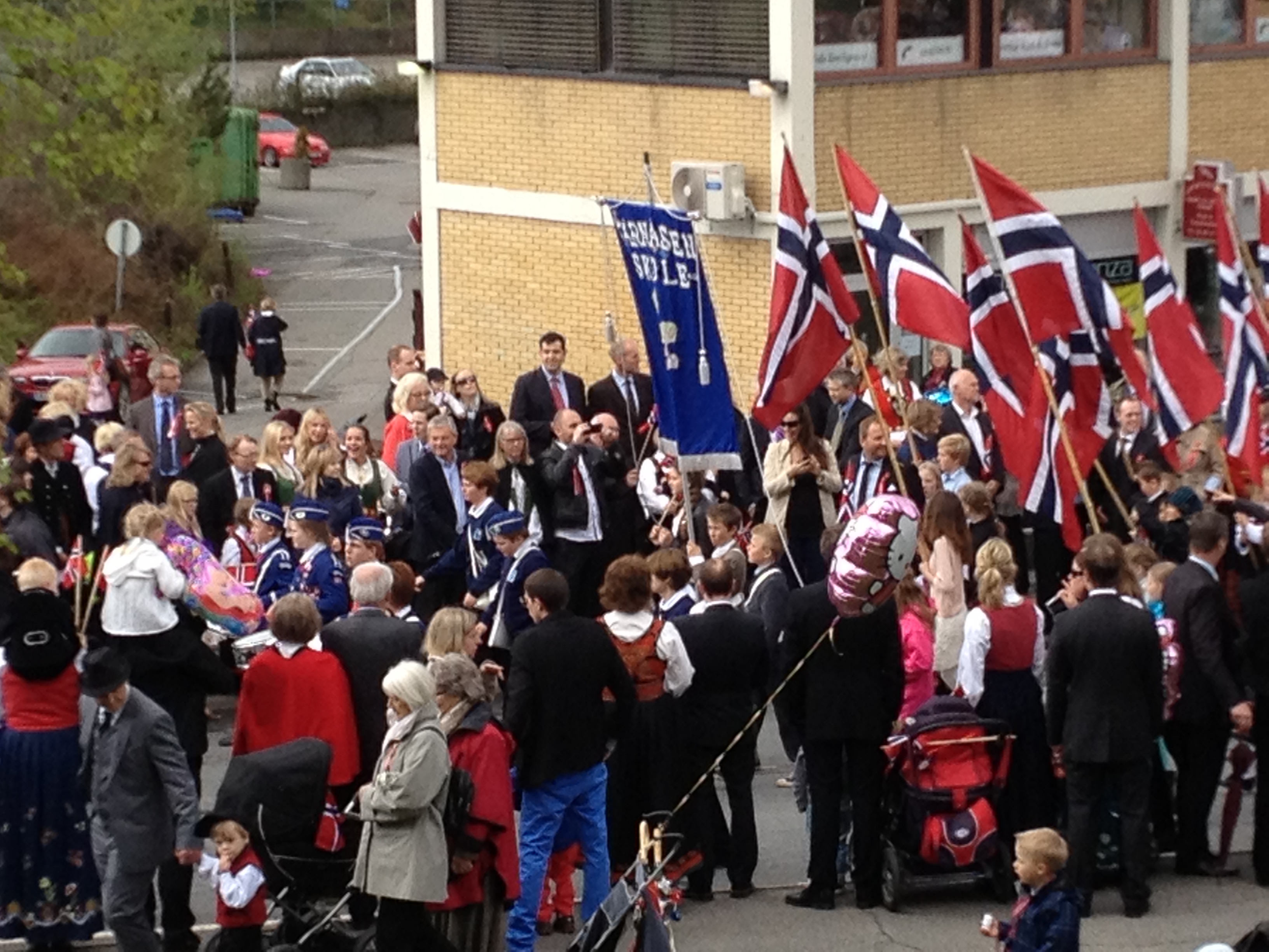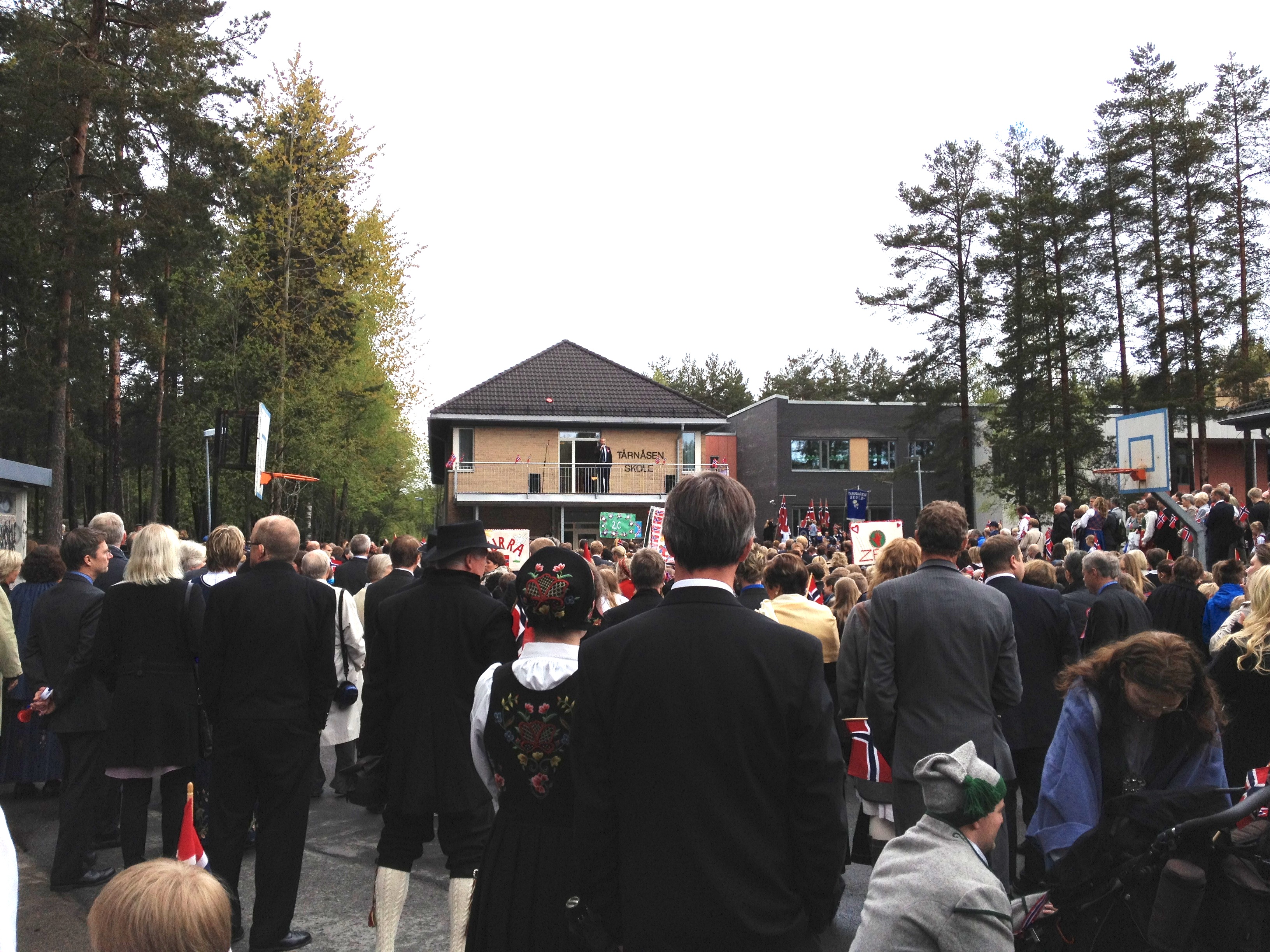 Barnetoget starter og vi skynder oss avgårde ned til stadion hvor det er innmarsj for alle skolene i området. Folkehavet stiller seg opp gatelangs og venter på sine håpefulle. Det kryr av foreldre, besteforeldre, tippoldeforeldre, onkler, tanter, kusiner, fettere, tremenninger, små barn, store barn, russ og ballongselgere.