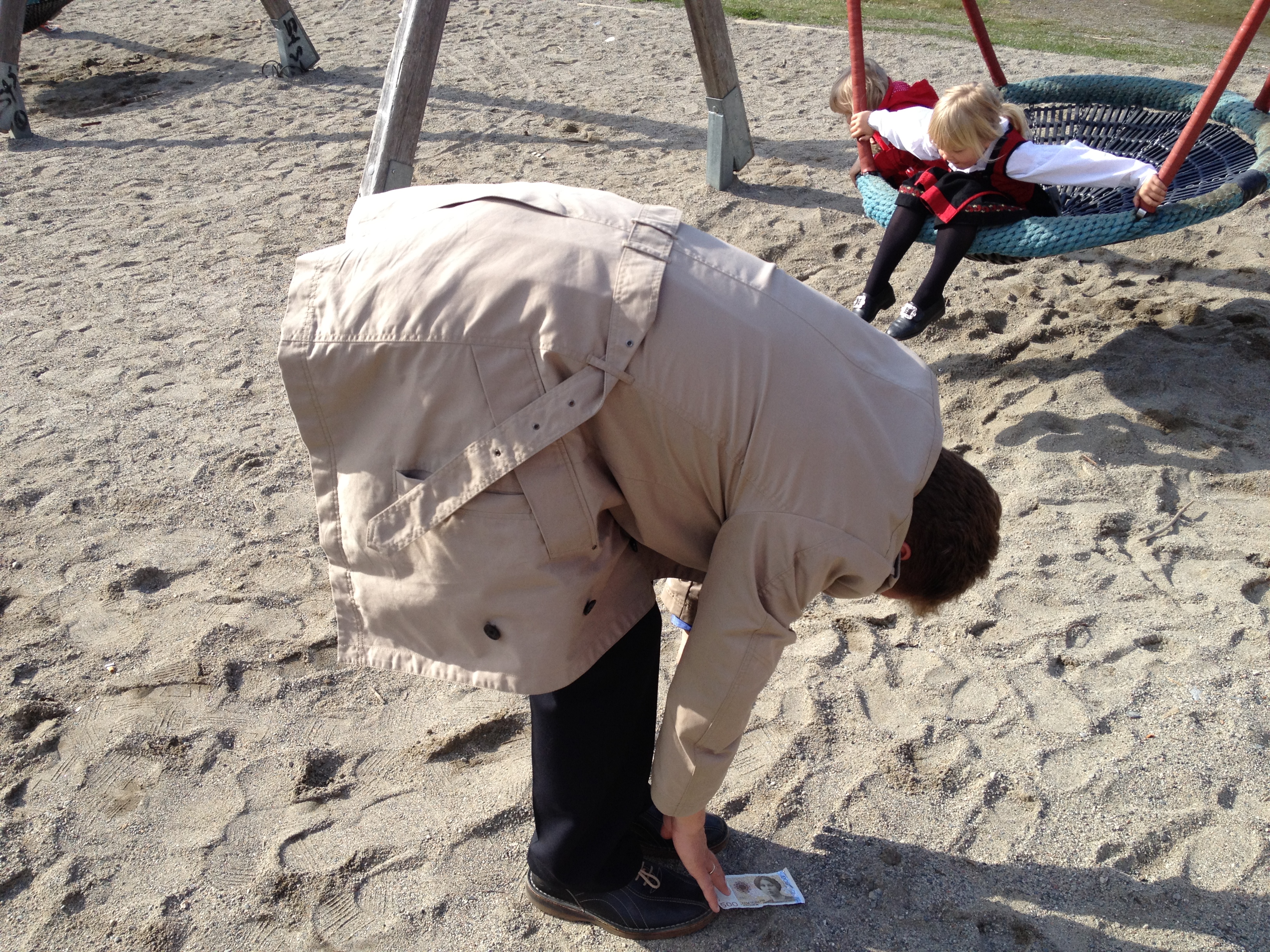 Jeg tar en 100-kroner seddel og lar den diskre falle til bakken. Jeg samler beina igjen, retter ut knærne og faller fremover mens jeg strekker meg etter seddelen. Billig triks, men det ser ut som om det funker. De som ser i min retning, ser raskt en annen vei, når de skjønner at klumsete-meg plukker opp penger jeg har mistet.