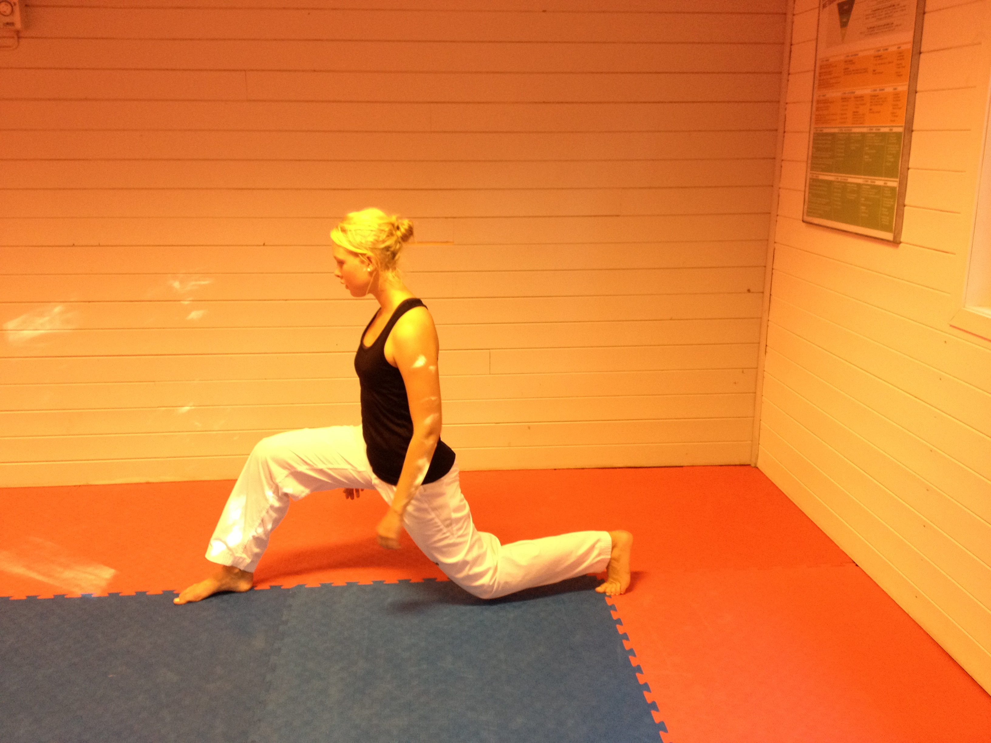 Deretter går vi ned til venstre side i «krigerstilling». Venstre bein bøyer 90 grader i kneet og høyre bein senker kneet mot gulvet uten å gå helt ned.