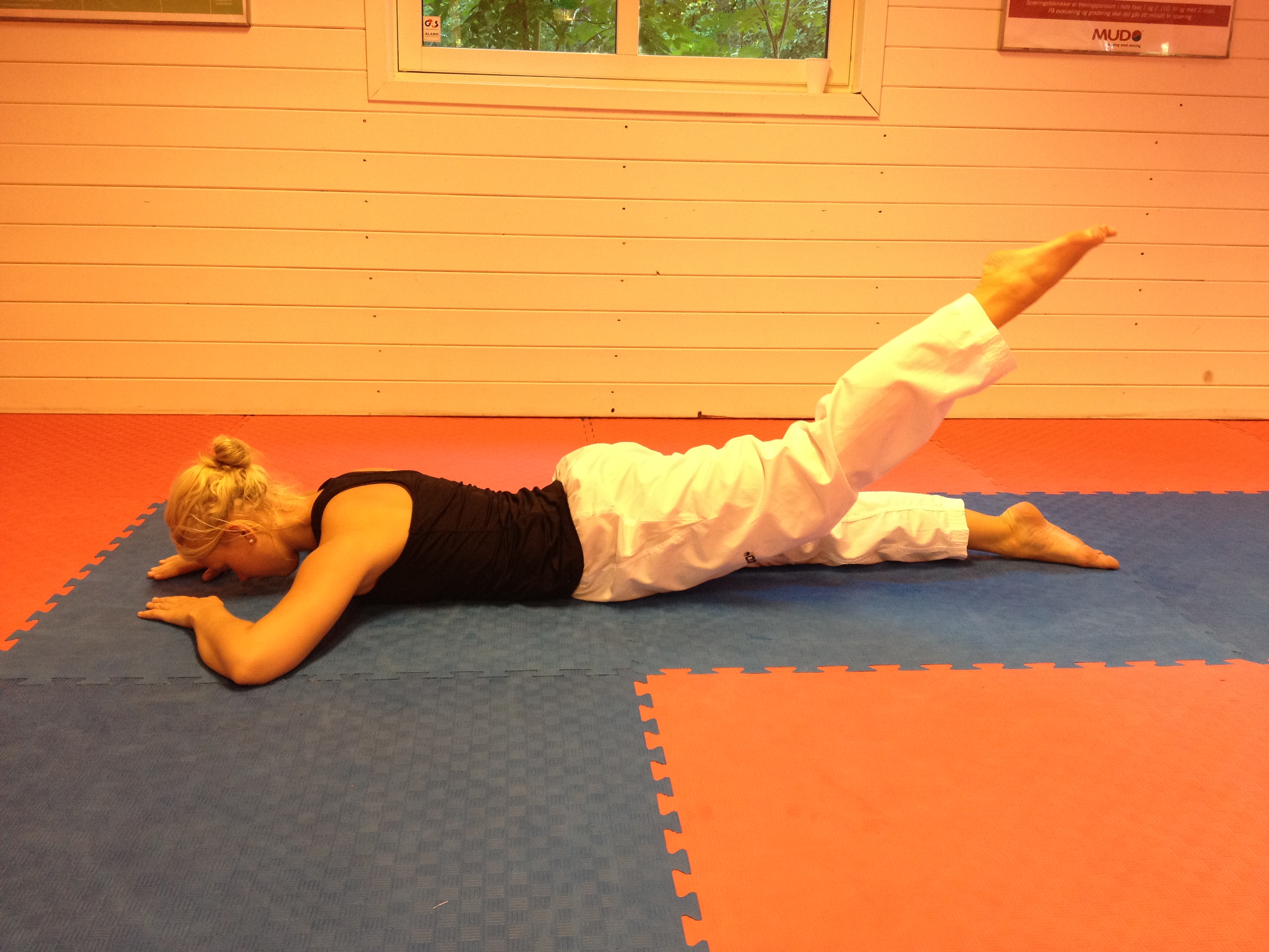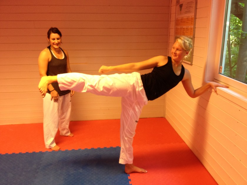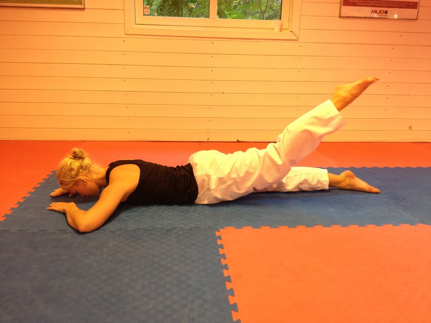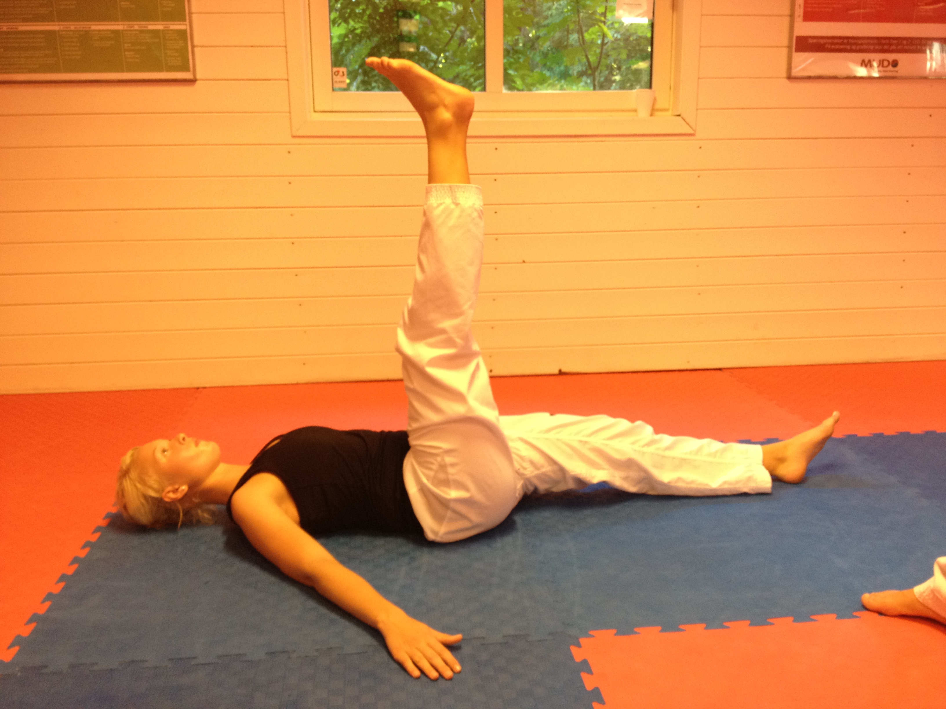 Denne øvelsen fokuserer på muskler og sener vi bruker når vi utfører sidespark og rundspark. Dette er mer en styrkeøvelse en enn ren stretchingøvelse, men den er utrolig virkningsfull med hensyn til å oppnå høyere spark 🙂