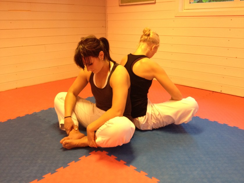 Vi fortsetter med innside lår og Malene og Stine setter seg ned rygg til rygg i skredderstilling. Fotbladene presses mot hverandre og beina trekkes så langt inn mot kroppen som mulig.