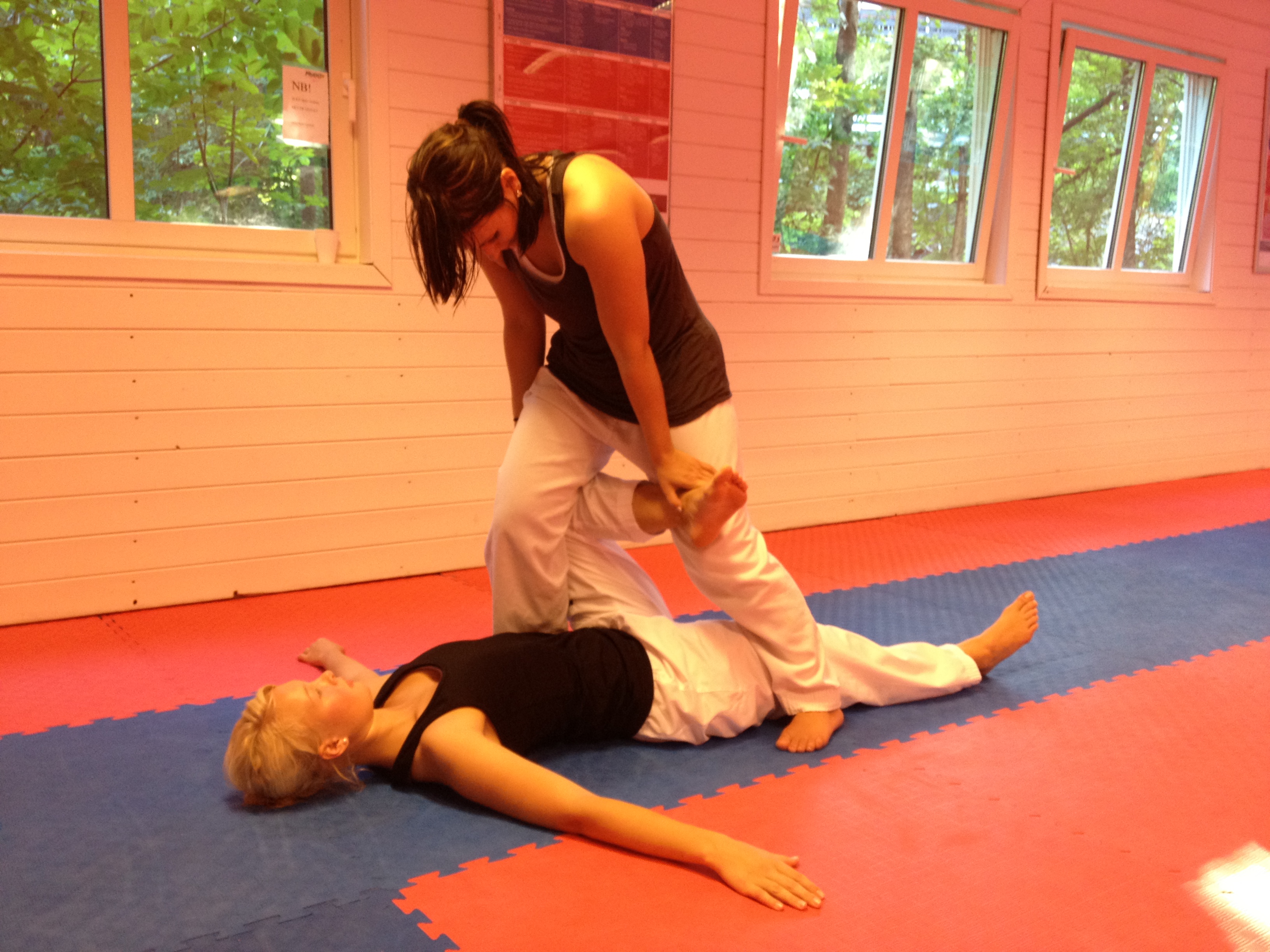 Da er vi kommet til siste øvelse. Stine ligger på ryggen, løfter opp det ene beinet og bøyer kneet. Malene plasserer seg slik at hun med sine bein kan presse Stine sitt bøyde ben mot henne og fremover samtidig. Malene og Stine kommuniserer hele tiden med hverandre og Malene legger ikke til mer press enn hva Stine føler er overkommelig.