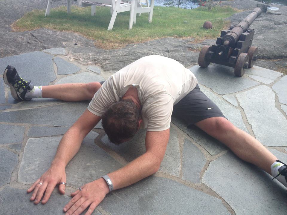 Vi er akkurat ferdig med dagens stretchingtime og de fleste av oss er svært fornøyd med timen og progresjonen så langt. Samtidig kan vi ikke annet enn å misunne denne karen her som ligger en del foran oss i løypa. Og selvsagt kan han ikke la være å gni det inn 😉