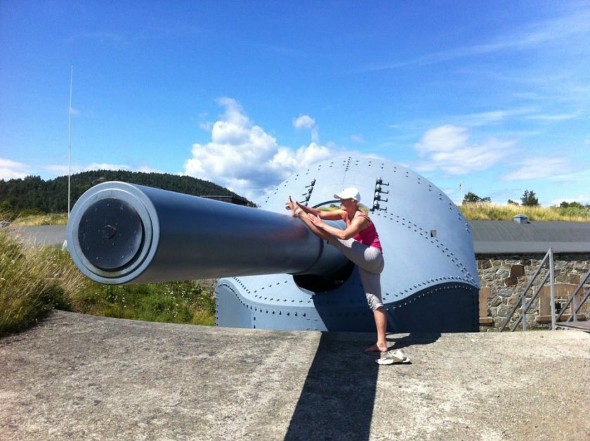 Stedet er Oscarsborg i Drøbak. Etter å ha sjekket at ammunisjonen ikke er våt, og at rekyldemperen fungerer, fininnstiller Ellen siktet ved å presse kanonløpet ned med den kjente kanonstretchen.