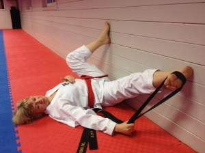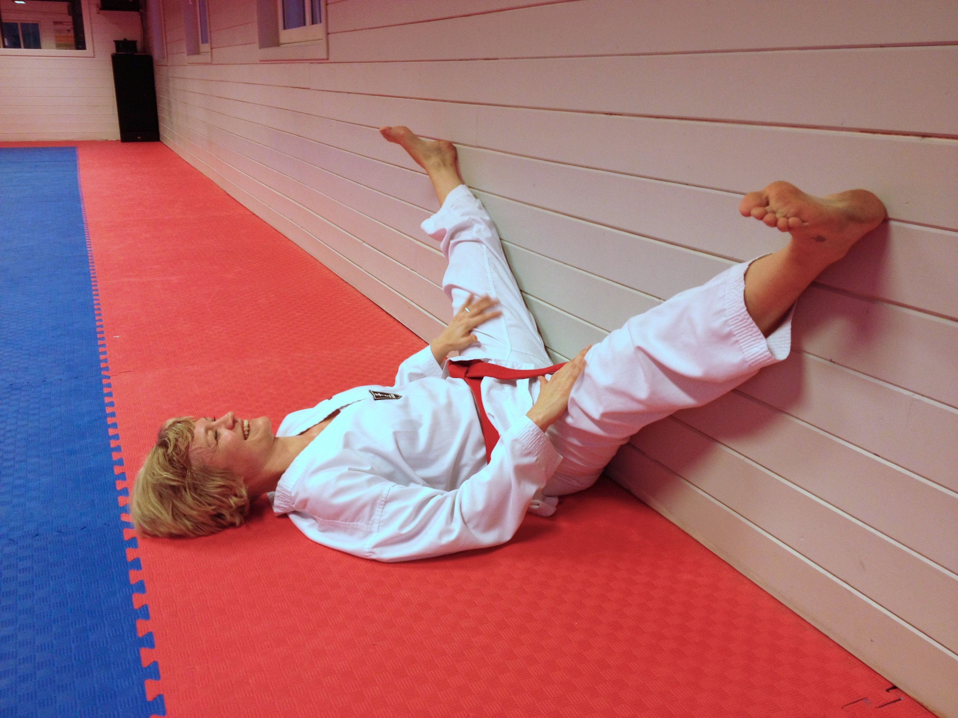 For å få bena enda litt lengre ut til sidene bruker jeg et belte eller et stretchingbånd som jeg fester til føttene. Da kan jeg trekke føttene enda noen centimeter lenger enn jeg ellers klarer.