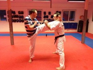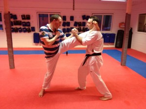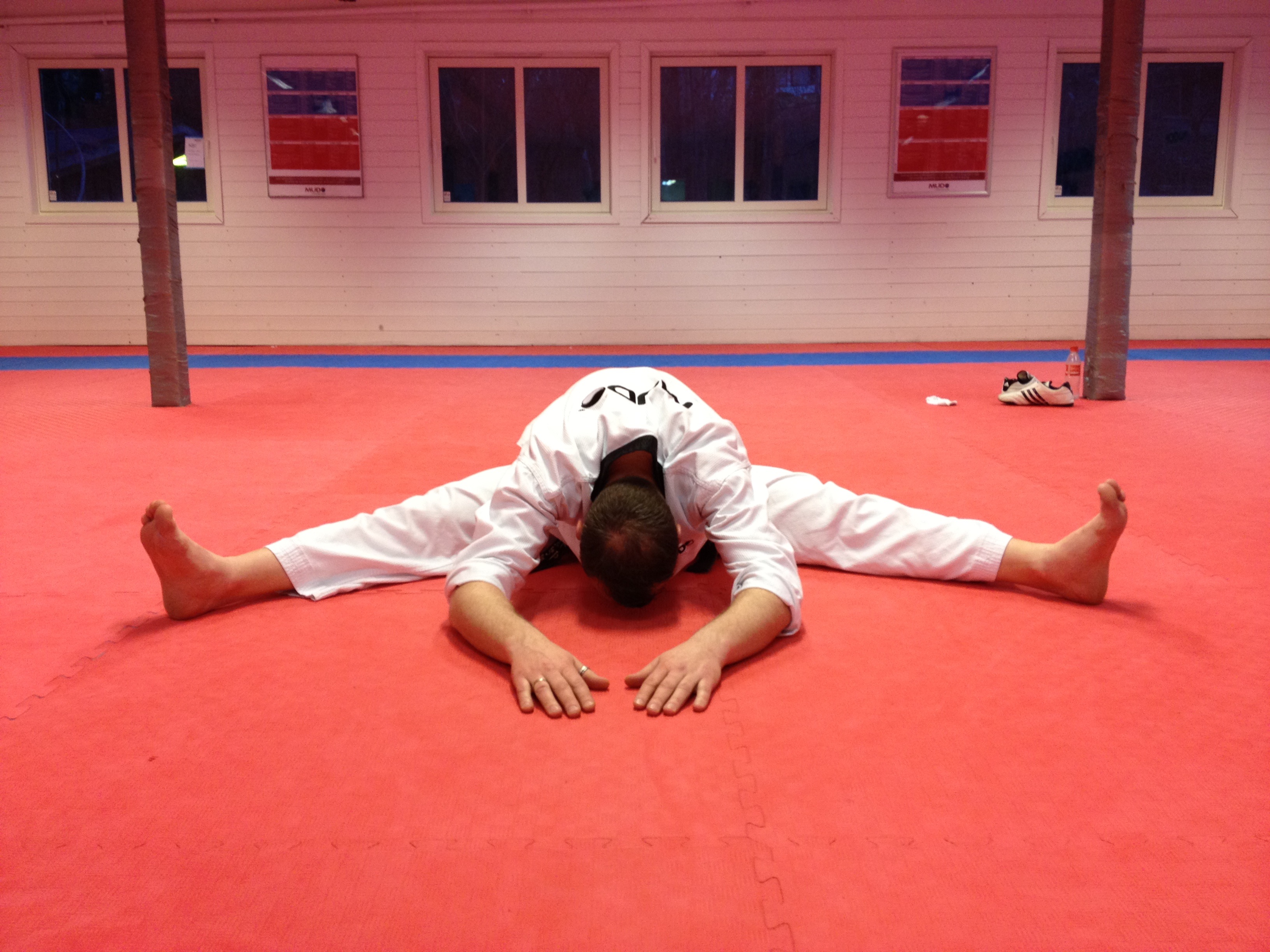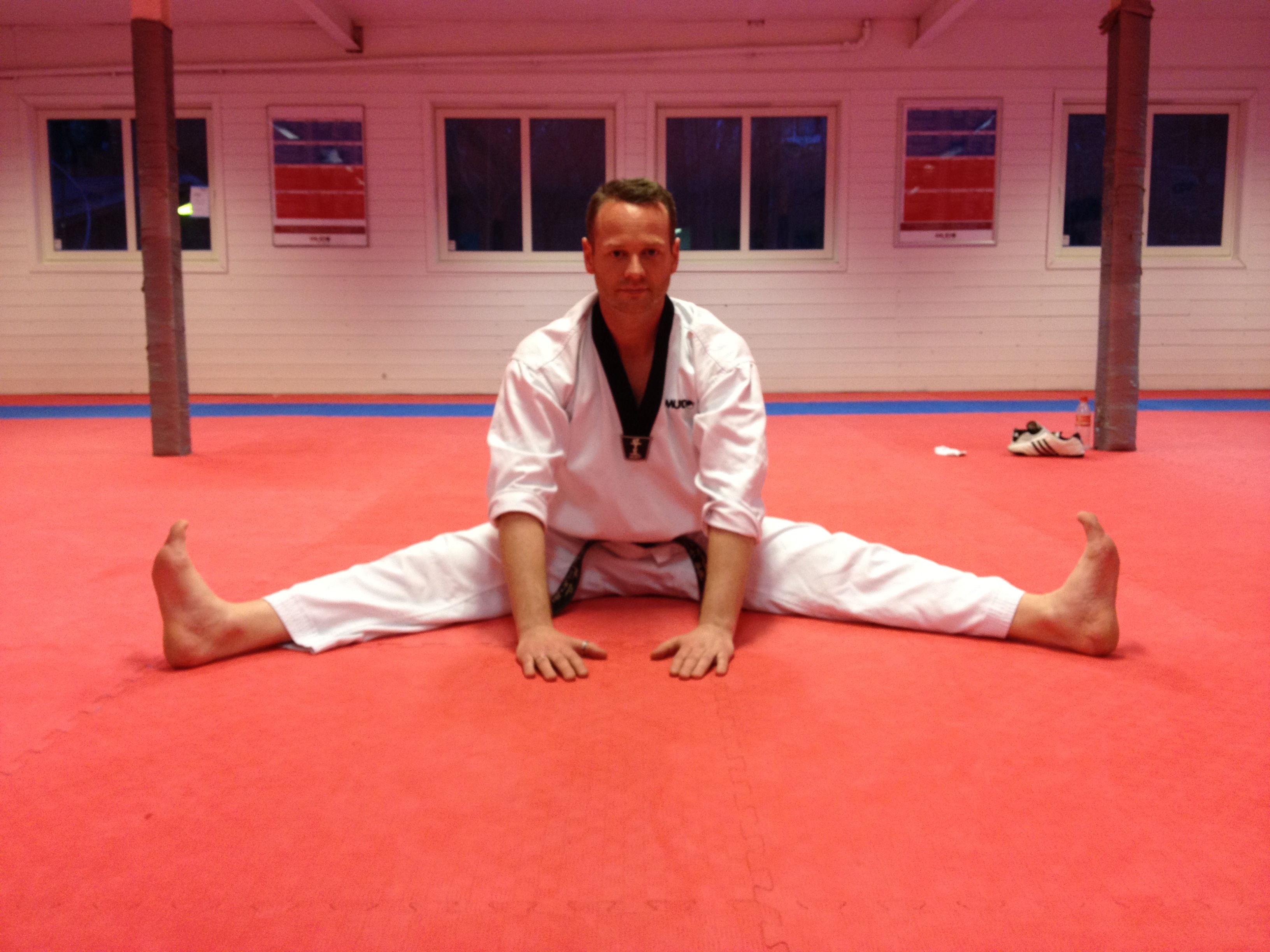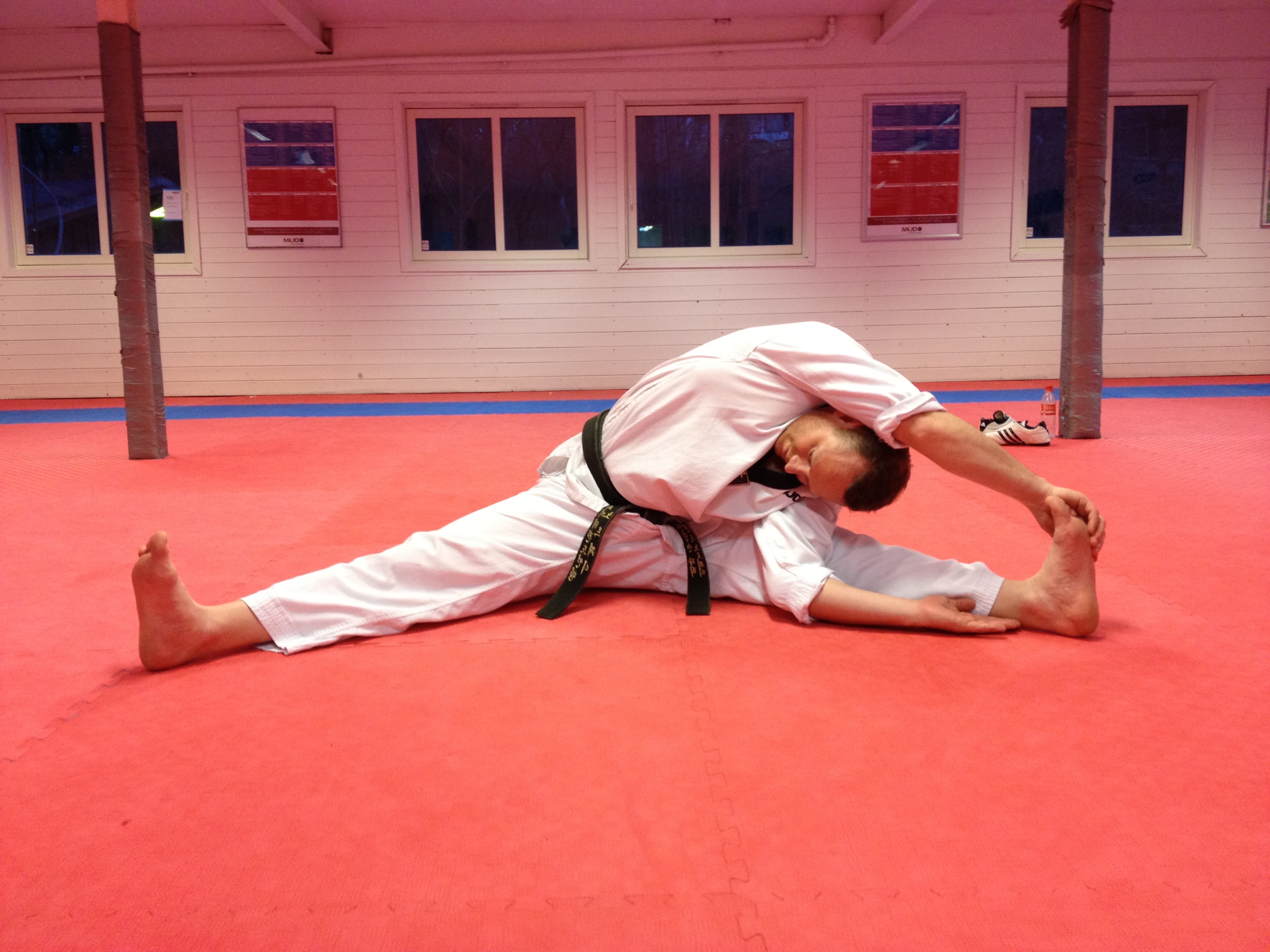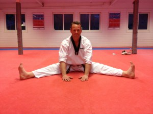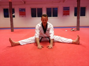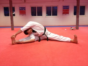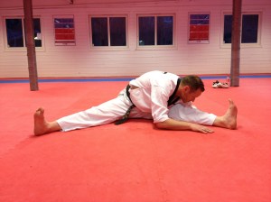 Øvelsen simulerer et typisk Taekwondospark samtidig som den strekker bra på baksiden av låret. Slik får jeg stretchet i samme stilling som jeg også sparker.