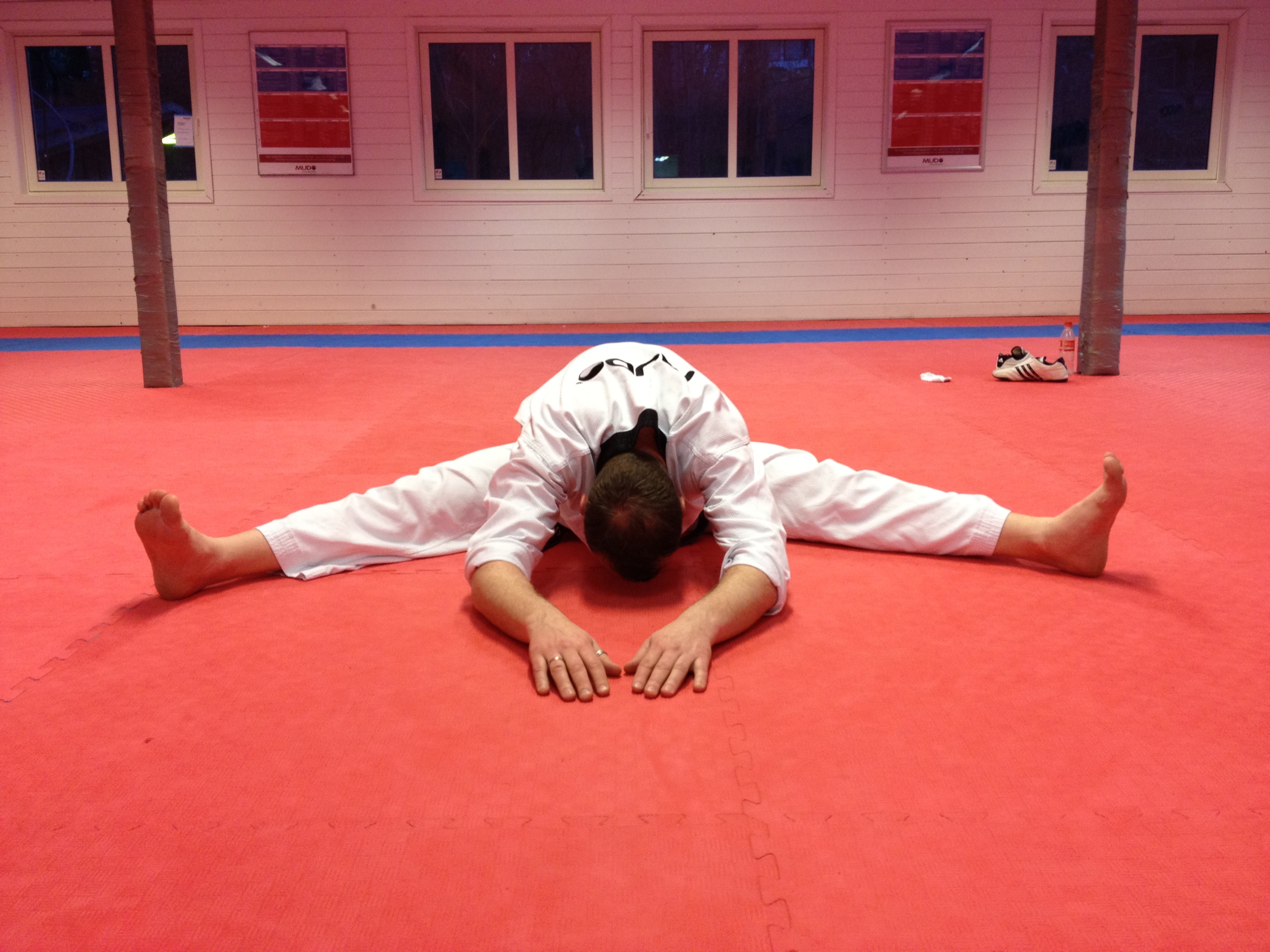 1. Utgangspunktet er sittende stilling hvor bena spres fra hverandre så langt man kommer.