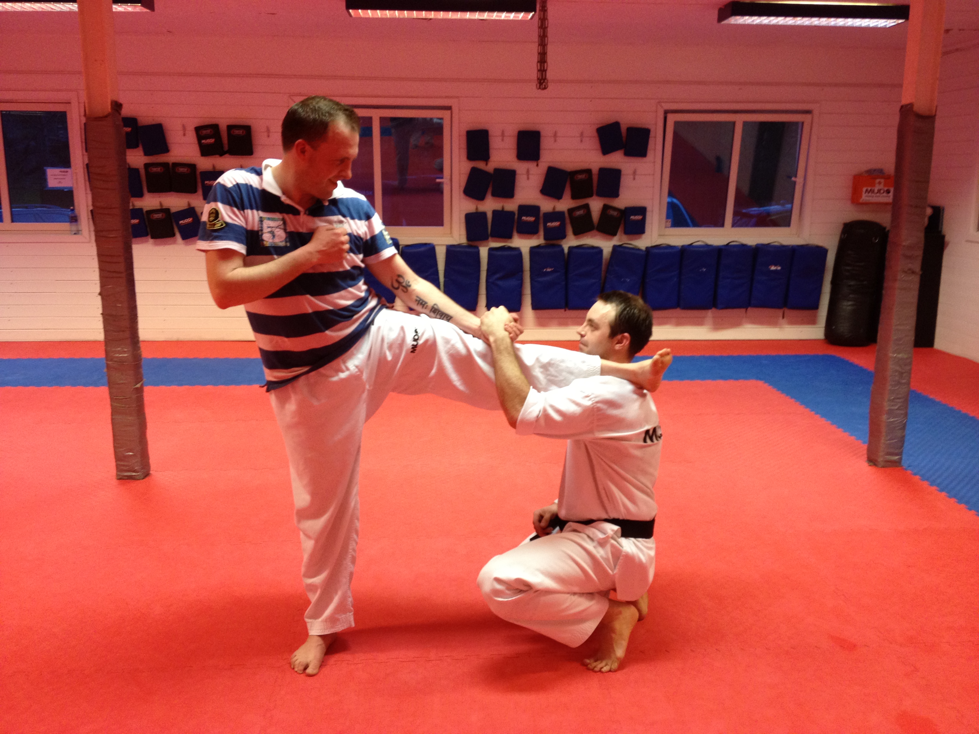 Øvelsen begynner ved at Johan går ned på et kne i «frierposisjon». Jeg takker høflig nei, og legger venstre bein opp på hans skulder. Han gir meg støtte og balanse ved å holde godt tak i min venstre neve.