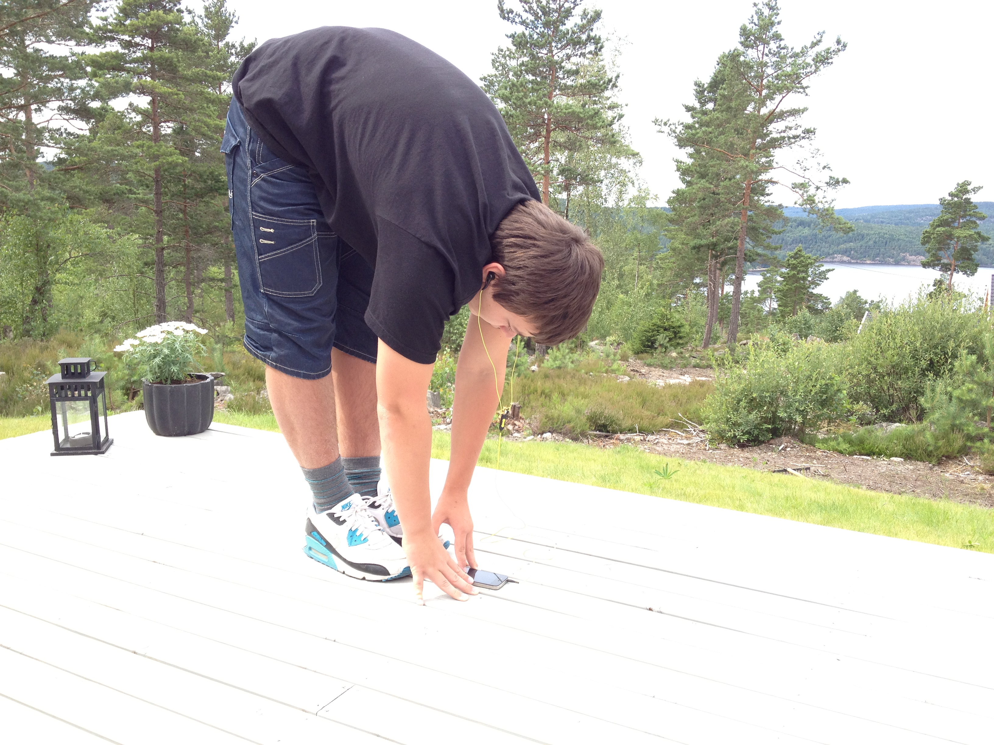 Kent beveger seg ikke langt uten å ha musikk på øra. Her legger han opp en ny spilleliste på iPhonen samtidig som han tar en typisk iStretch.