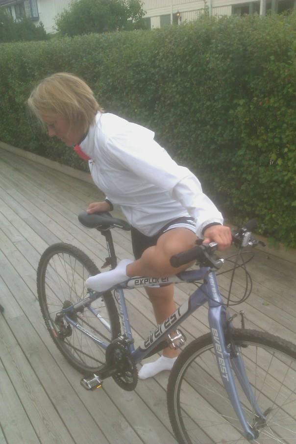 Mamma Wenche er inspirert av sin sønn og benytter her sykkelen til å stretche innside lår samt hofte. Off road-ramma har en perfekt vinkel for denne øvelsen. Wenche kan enkelt avansere øvelsen ved å lene seg fremover over sete eller bøye ståbeinet. Legg merke til hvordan kneet da vil plassere seg naturlig i mellomrommet i ramma.